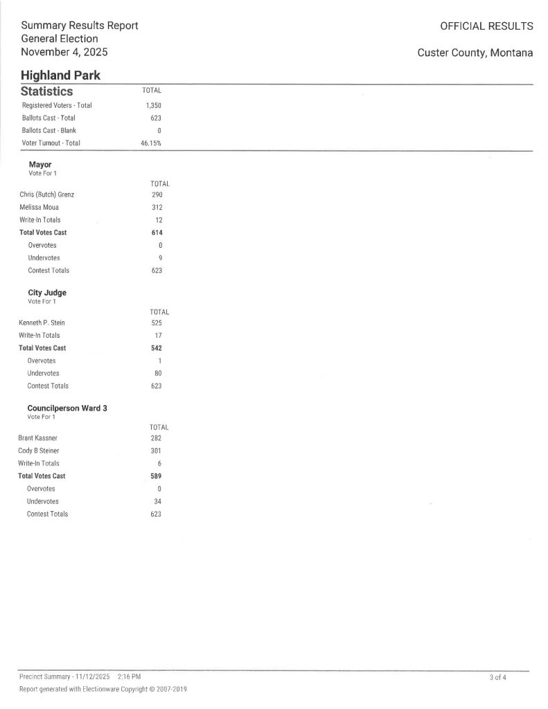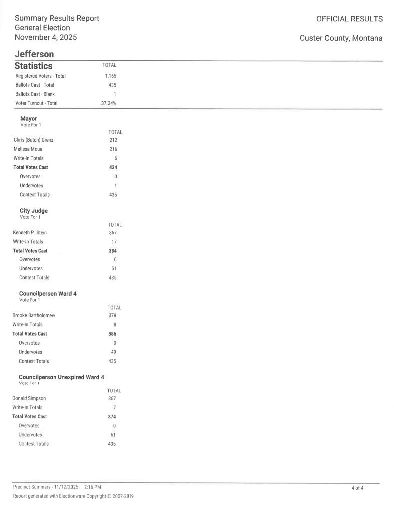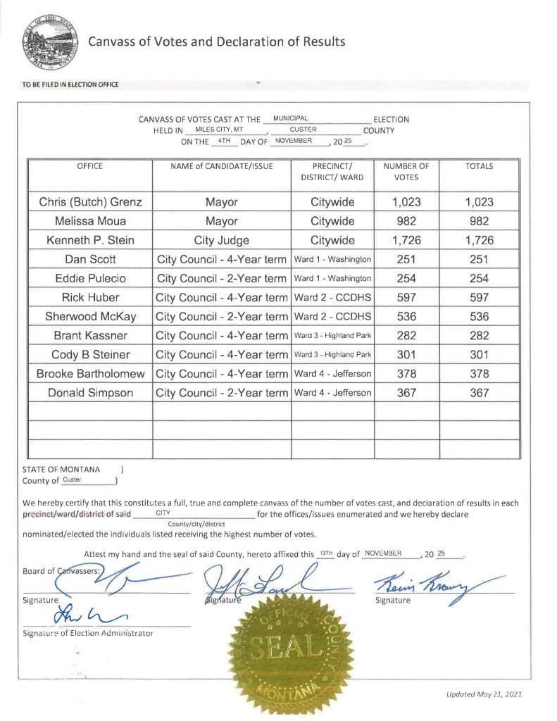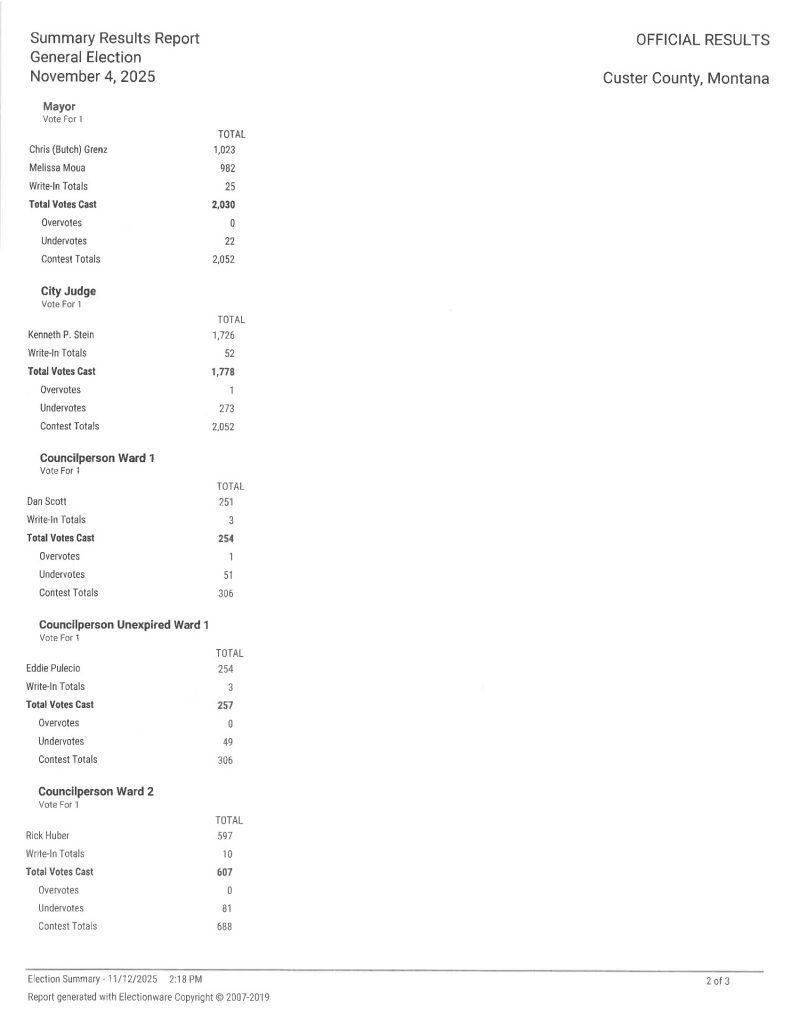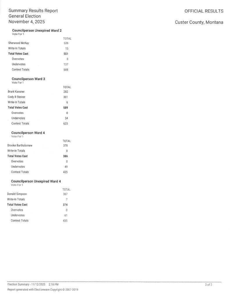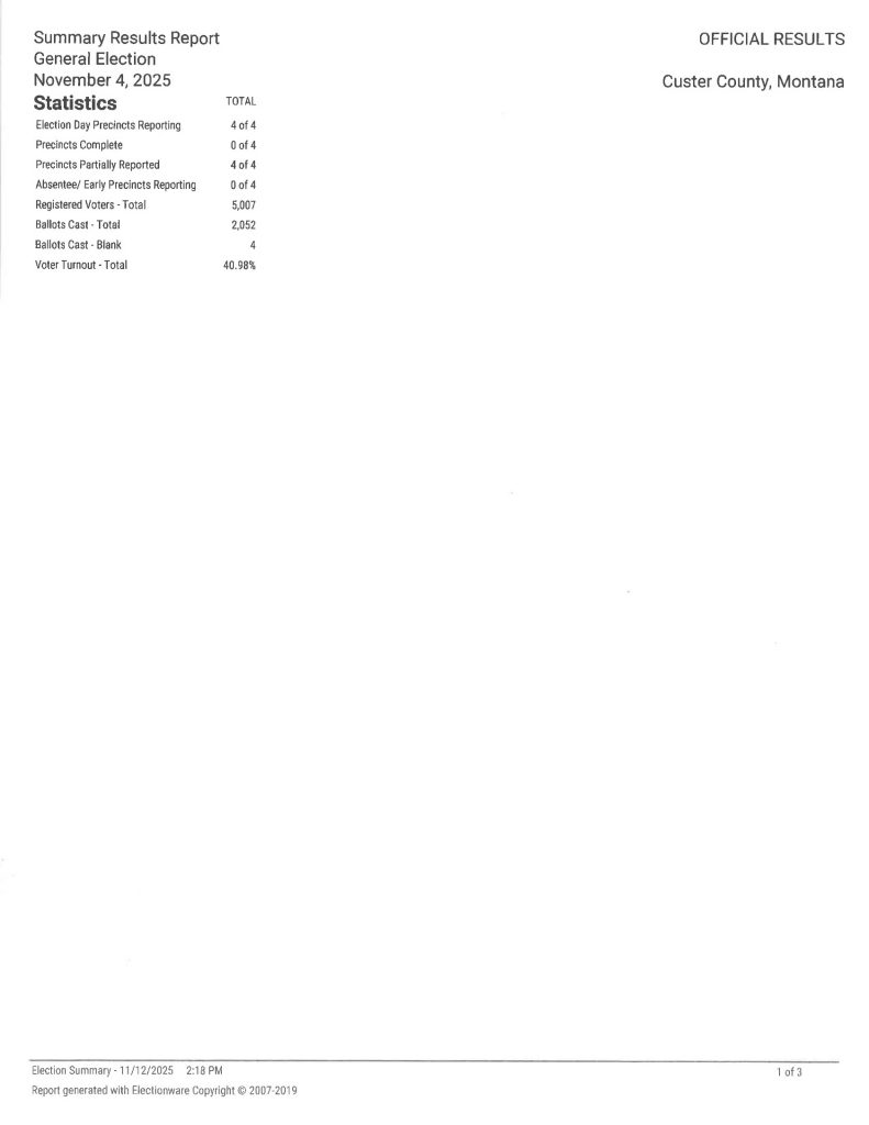 Below are the results of the Canvass of the 2025 Municipal General Election held in Custer County, MT on November 4, 2025. You may also download a copy here >